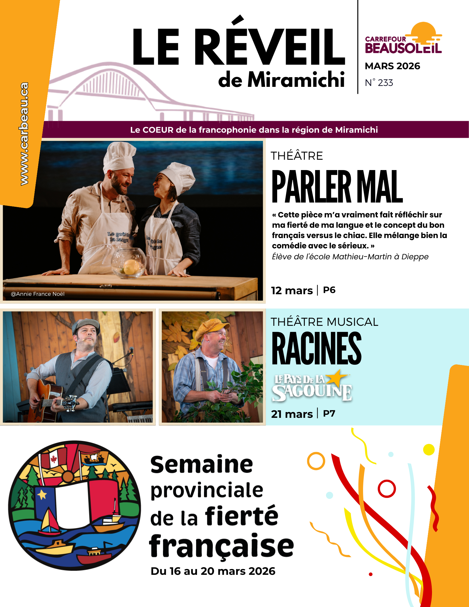 Vous y trouverez des articles sur les activités, spectacles, événements et réalisations qui concernent et intéressent la communauté francophone et francophile de la région de Miramichi.