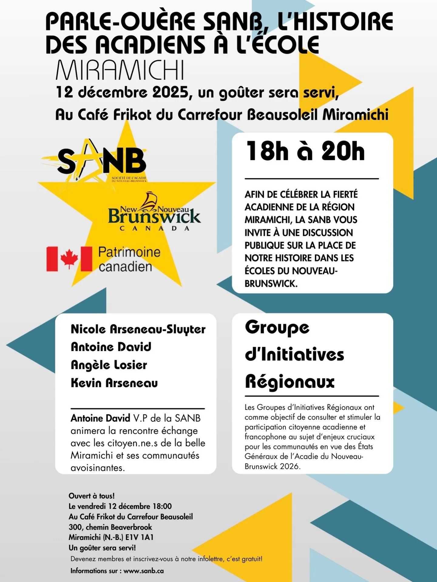 Afin de célébrer la fierté acadienne de la région de Miramichi, la Société de l'Acadie du Nouveau-Brunswick (SANB) vous invite à une discussion publique sur la place de notre histoire dans les écoles du Nouveau-Brunswick.