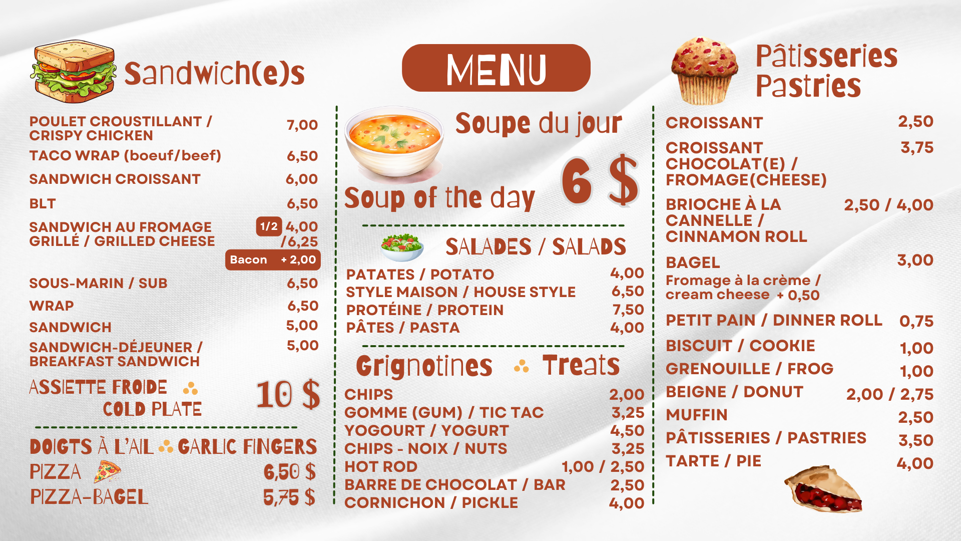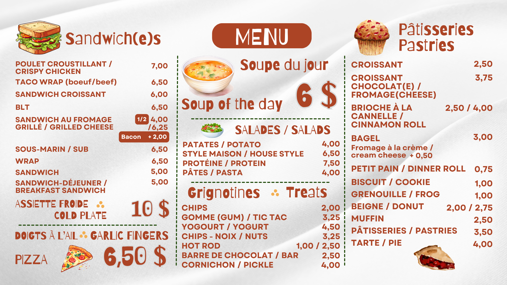 Il propose un menu varié (café, muffins, sandwichs, soupe du jour, spéciaux, croissants, boissons, etc.), à des prix abordables… et surtout DÉLICIEUX!