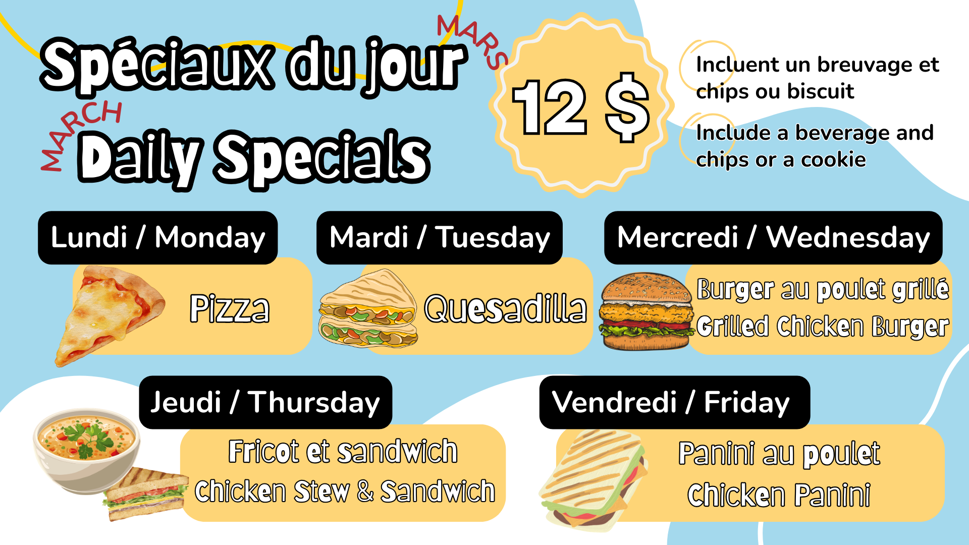 L’objectif principal des services alimentaires est de nourrir nos enfants en garderie, les élèves et le personnel de l’école Carrefour Beausoleil et du Carrefour Beausoleil.